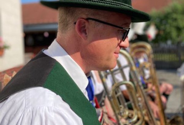 Fronleichnam-Gottesdienst. Patrick studiert nochmal seine Noten. St. Jakob